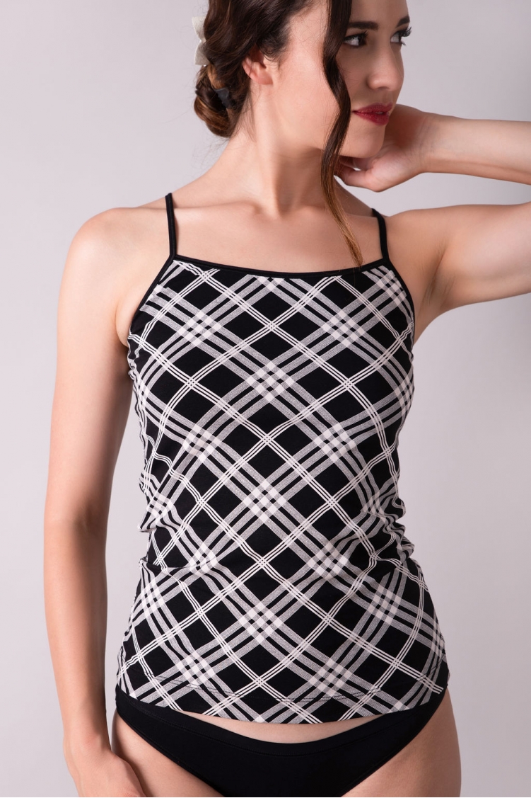 Das Unterhemd mit dünnen Trägern besteht aus leichtem und atmungsaktivem Material mit einem schönen schwarz-weiß Karomuster, das sich ideal zum Tragen unter der Kleidung eignet. Die leichten Nähte sorgen für das Gefühl, nichts an sich zu tragen.Material