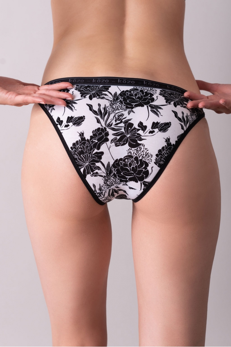 The combination of a material with a floral pattern for comfort that lasts for the whole day and an athletic design resulted in the string bikini panties. The modern and athletic design is trimmed with precision to the last detail. The elastic band bearing the KOZO logo along the edge of the panties provides an exceptional aesthetic appearance, adjusting to every body shape without causing skin irritation.Material