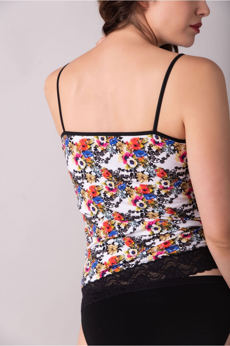 The undershirt with a brightly coloured floral pattern and thin straps is made of a light and breathable material combined with lace that is ideal for wearing beneath clothes. The light stitches provide a feeling as if you are not wearing anything.Material